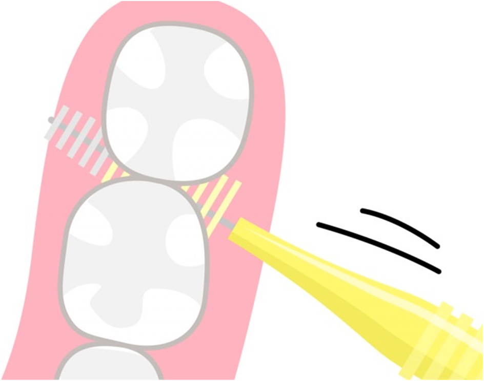 鏡を見ながら場所を確認し、歯と歯の間に優しくスライドさせながら入れ、歯茎の少し中まで入れます。強く押し入れたり、無理に押し込むと歯茎が傷ついてしまう可能性があるので注意してください。