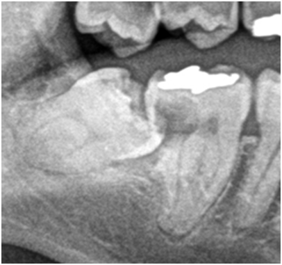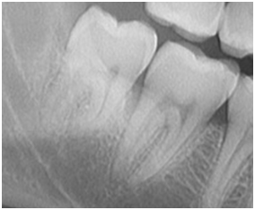 次の画像は、手前の歯の虫歯は確認されませんが、親知らずの頭の周辺が全体的に黒く抜けており、骨が溶けてしまっている状態です。これも親知らずが原因で、歯周病が進行した結果です。