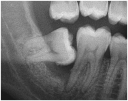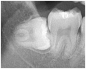 上の画像は、親知らずの手前の歯に黒い影ができているのが分かると思いますが、この黒い影がいわゆる虫歯です。親知らずが、隣の歯に衝突し清掃性が悪くなることで、こういった虫歯の原因になることがあります。